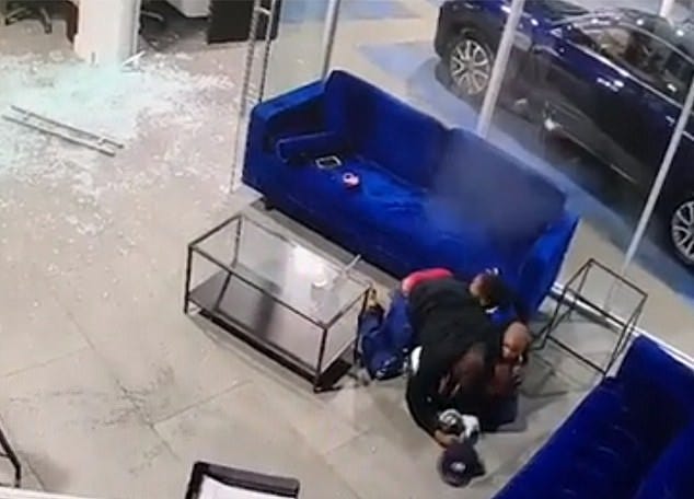 In the surveillance video, the father is seen sitting with his kids when a gunman entered the dealership directly behind them. He began firing his weapon at another man inside the dealership, who began to fire his weapon in return.