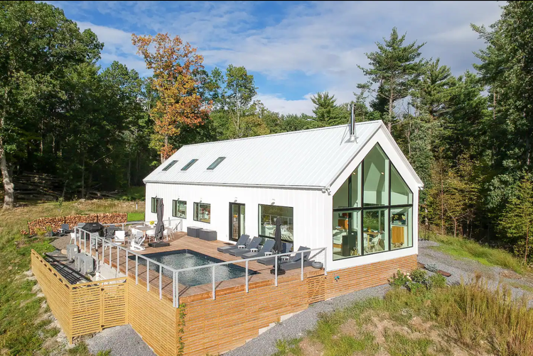 Escape to Birch & Buck, a modern Catskills lodge set on 13 private acres with breathtaking mountain views. This stunning retreat features four bedrooms with en-suite luxe baths, a heated pool, a cozy wood-burning stove, and a firepit, making it perfect for relaxation and comfort. Conveniently located near top dining, shopping, and outdoor activities, it's an ideal spot for a serene and memorable getaway just 2.5 hours from New York City.