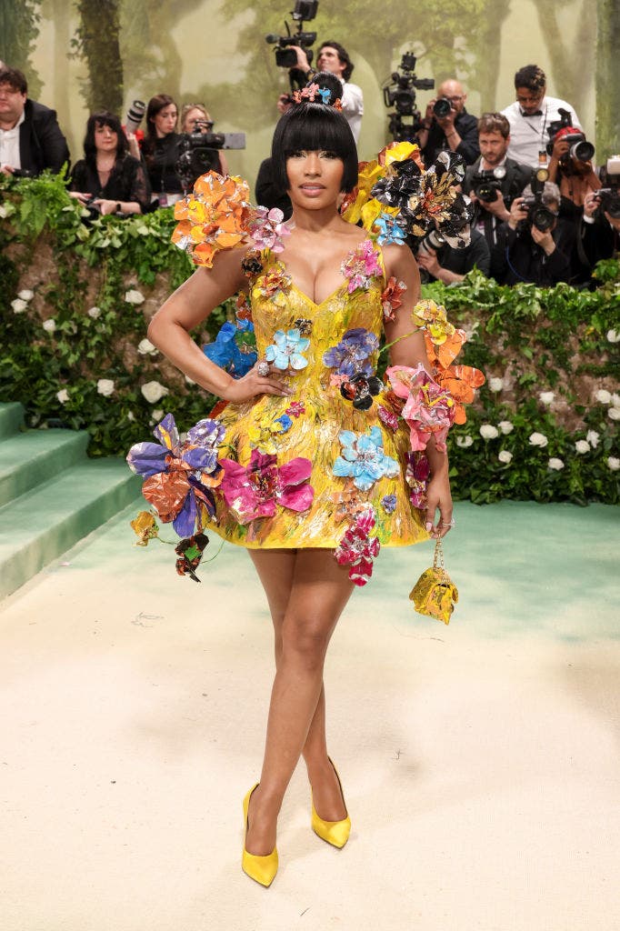 Nicki Minaj descended on the steps in a playful, custom, yellow metallic dress by Marni with miniature flowers embedded throughout and on her shoulder straps. She completed the look with yellow accessories and floral-themed hair that gave a fairytale nymph vibe.