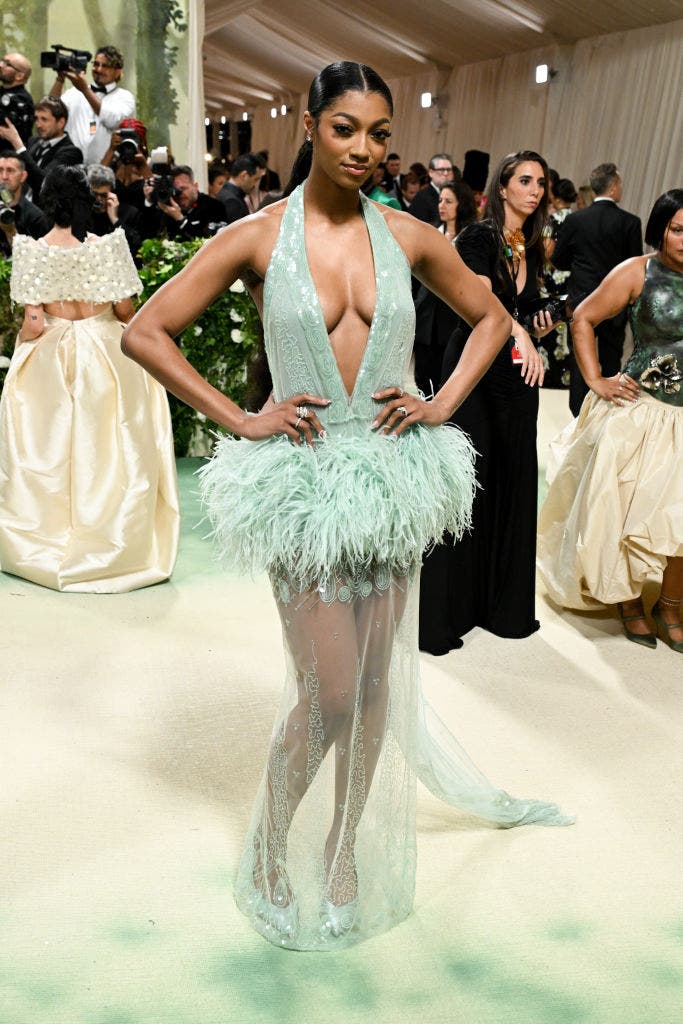 Angel Reese, the former LSU basketball phenom, made her Met Gala debut on her 22nd birthday wearing a sparkly, mint-green custom 16Arlington dress that featured a plunging V-neck and a sheer, floor length skirt with feathers around the waist. The Bayou Barbie looked beautiful and set the tone for what is to come for her in the fashion arena.
