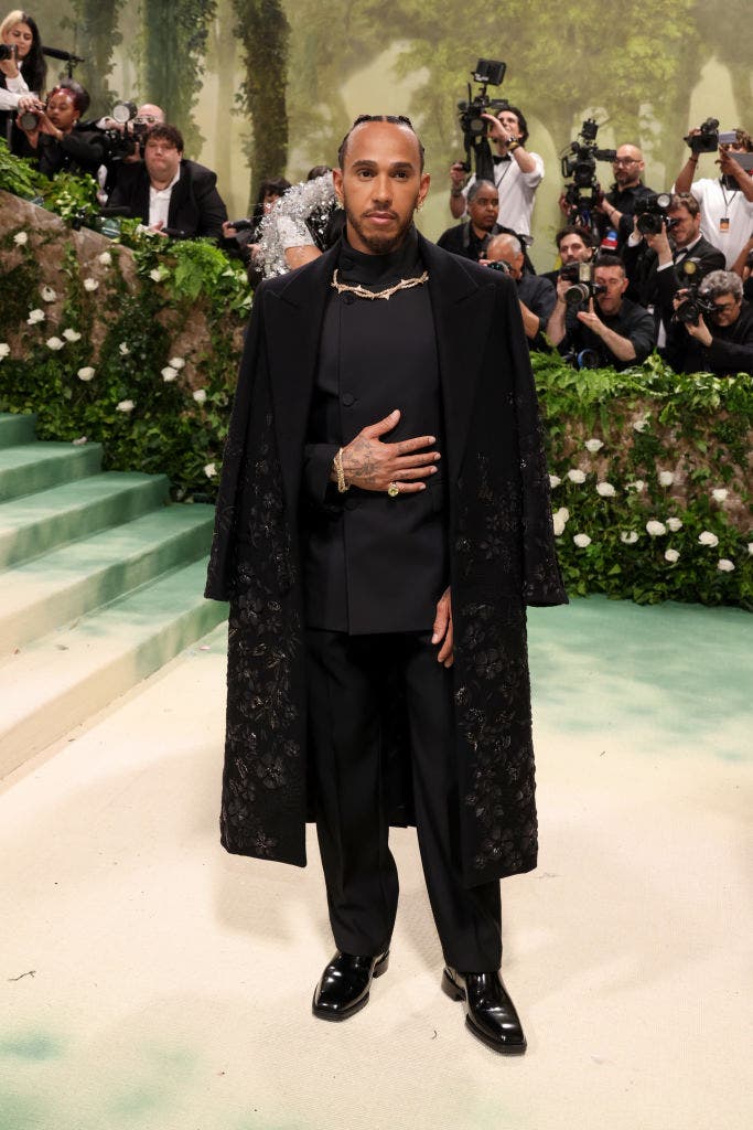 Sir Lewis Hamilton hit the carpet in a custom Burberry ensemble by Daniel Lee that consisted of a wool overcoat with floral embroidery and a double-breasted suit. The look was inspired by an 18th-century slave who became the first Black gardener in Wales and included winning details like a diamond thorn necklace.