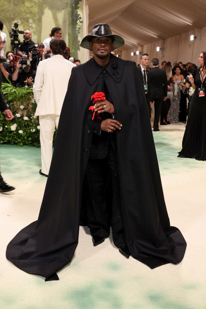 Usher wore a multi-layered and theatrical black Alexander McQueen look that hit all aspects of the Garden of Time theme. The R&B king’s ensemble consisted of a dramatic black overcoat, a suit with red and black floral dripping details, and a leather wide-brimmed top hat.