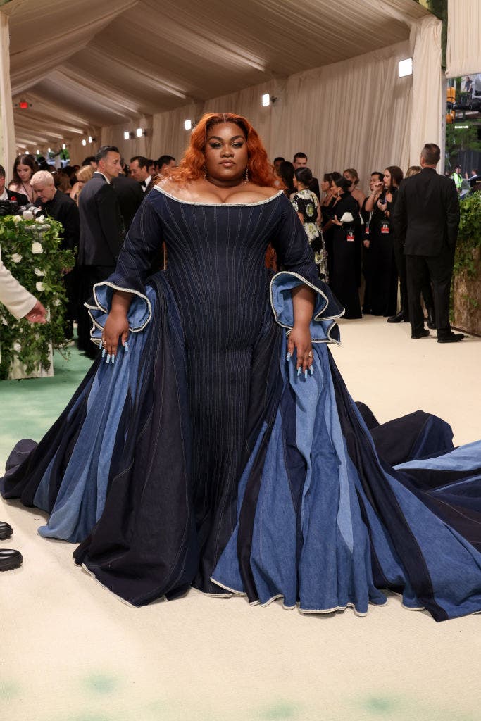 Da’Vine Joy Randolph was the only guest in The Garden of Time to wear denim and she looked incredible! Her perfectly tailored, two-toned custom Gap gown hugged her body in all the right places with billowing sleeves and a cascading long train that decorated the carpet. She accessorized with denim nails and minimal jewelry.
