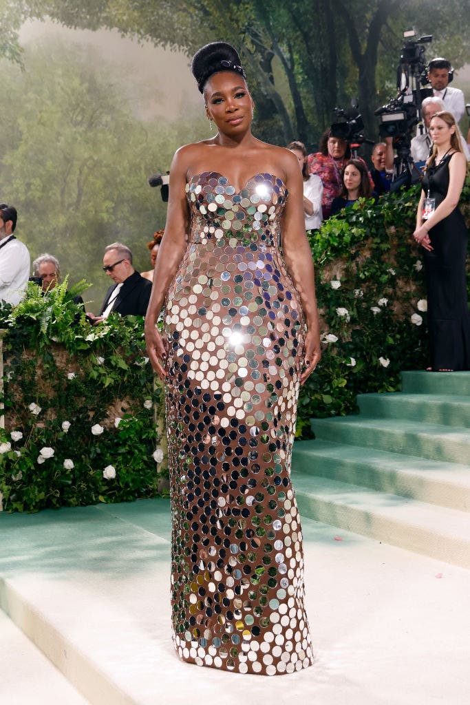 Venus Williams stunned in a custom sheer and strapless Marc Jacobs gown with mirrored paillettes. She completed the look with a braided updo and minimal jewelry that really let her shine bright!