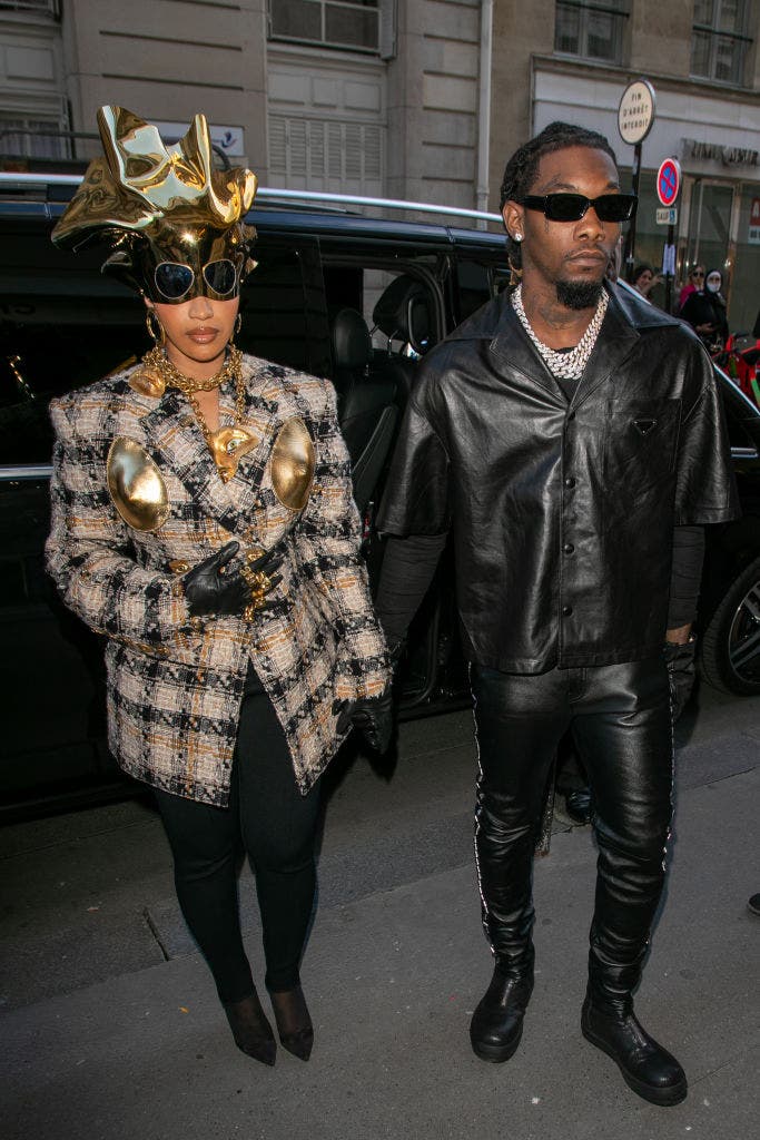 During an outing with Offset in Paris, Cardi B brought Schiaparelli to the streets in style. She sported a tweed-style coat adorned with a striking gold breastplate and accessorized with a hefty chain necklace. The centerpiece of her ensemble was a gigantic gold headpiece that doubled as sunglasses, adding a dramatic flair to her streetwear chic. Cardi B's fashion-forward look once again demonstrated her fearless approach to style and her ability to turn heads wherever she goes.