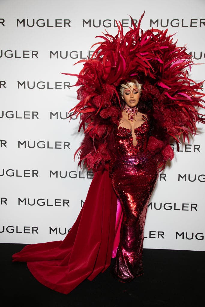 Cardi B stole the spotlight during Paris Fashion Week at the Thierry Mugler: Couturissime museum exhibit opening. Wearing a dazzling red sequined dress paired with a silk train, complemented by an exquisite feather headdress she confidently owned the carpet. Designed by Mugler, the ensemble exuded high fashion and sophistication with its intricate details and luxurious textures.