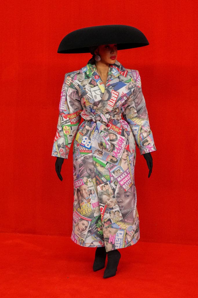 Cardi B made a bold statement at the Balenciaga womenswear spring/summer 2022 show during Paris Fashion Week at Theatre Du Chatelet in October 2021. She wore a coat-like ensemble adorned with a collage of magazines, creating a dynamic and eye-catching look. Completing her outfit was an umbrella-style hat and black gloves, adding a touch of avant-garde flair to her runway appearance.