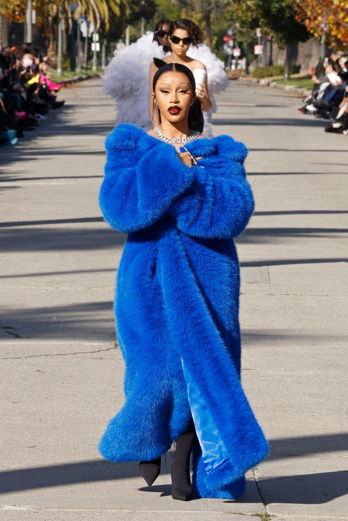 Cardi B made a memorable statement at the 2023 Balenciaga fashion show, slaying a luxurious blue fur coat paired with sleek black tights. Her look is screams of the early '90s with thin eyebrows, adding a nostalgic touch to her ensemble. The combination of the plush fur and minimalist tights created a striking contrast, highlighting her bold and eclectic fashion sense. Cardi B's appearance on the runway underscored her ability to blend high fashion with personal style.