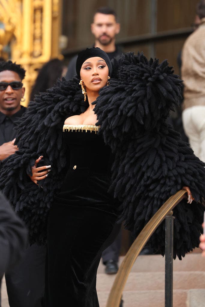 Cardi B rocked custom Schiaparelli Haute Couture fall/winter 2023-2024 at the show's unveiling in Paris’ Petit Palais for Haute Couture Week. Designed by Daniel Roseberry, her ensemble featured a striking black dress adorned with intricate gold details, perfectly complemented by a matching feather jacket. She added a touch of urban chic with a black head scarf and chunky gold accessories, creating a look that exuded both opulence and c**t.