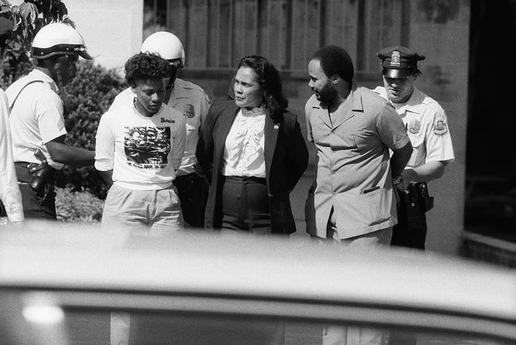 After her husband’s assassination, she expanded the civil rights struggle to an international level, meeting with leaders like Nelson Mandela and Corazon Aquino. In 1985, she was arrested alongside her children at the South African Embassy in Washington, D.C., protesting apartheid. Her global approach to justice showed that the fight for Black liberation knows no borders.