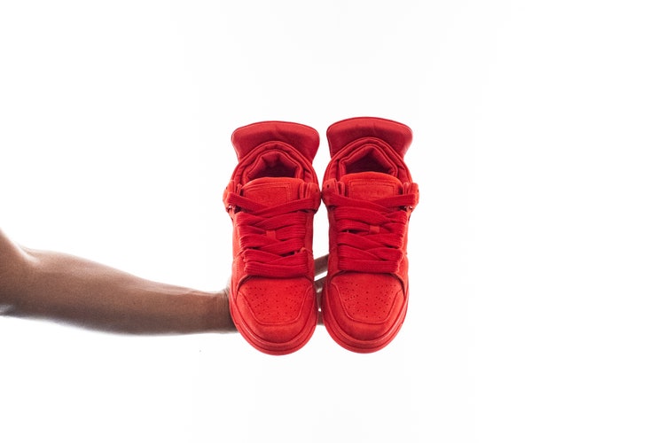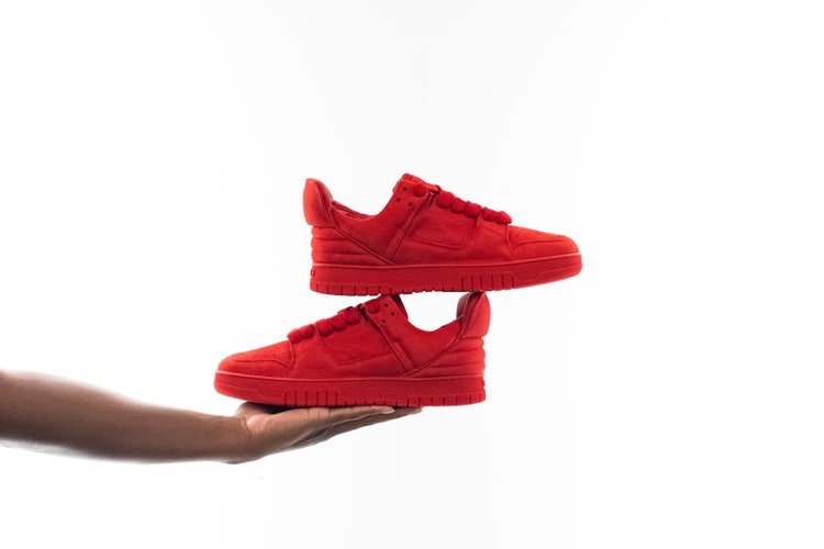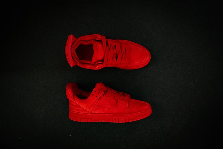 The Louis Vuitton Don sneaker capsulated a moment in time for designer Jordan. His inability to acquire a pair he liked fueled the design for the Skate Low. It's a luxurious skater-inspired sneaker made in Italy with a 100 percent nubuck upper in red and a rubber sole. Standout details include its double-lined insole and lacing unit, padded tongue, thick matching oversized red laces, and a massive back heel upper shaft named the "spoiler" that makes for a marquee silhouette detail.