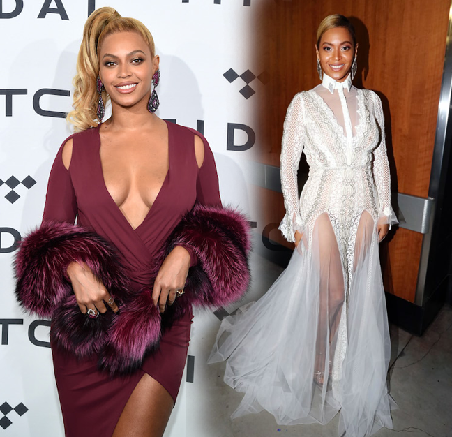 In 2015 Beyoncé slayed in her mauve-colored dress with peek-a-boo slits and asymmetrical bottom that shows off her great legs. She’s successfully married all the things she loves in one shot. While her white dress for this years Grammy’s wasn’t all that exciting on camera, up close the prints and fabric coupled with the vision behind “Formation”—this outfit makes a statement and makes sense.