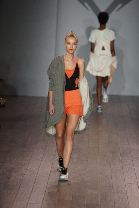 As the lights set, DJ Quiana Parks cued the music with a high-energy mix of trap and EDM. The models paced back and forth sporting grey and black with pops of colors. Angela incorporated designs with draped cowls and drop-crotch pants for gym-to-everyday transition apparel. Notably, she wore a pale blue printed bomber that is a must-have from the collection. At the end, attendees got a surprise performance from the Energizer Bunny and his band — needless to say, we were charged up!