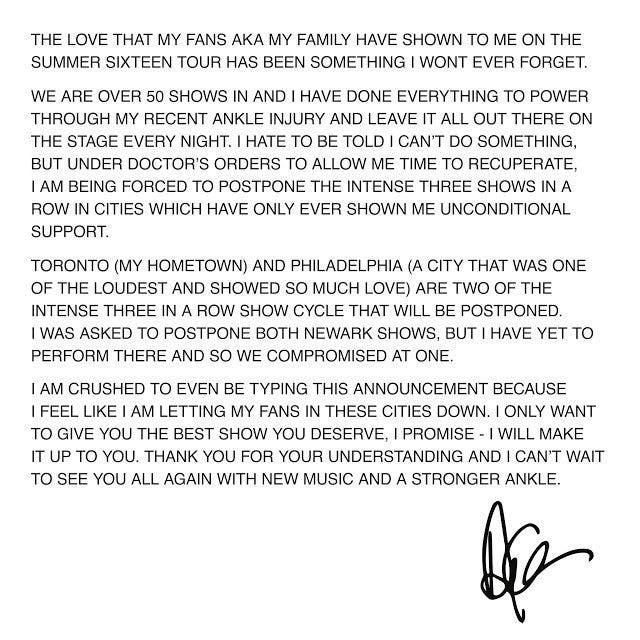 Drake fans in Toronto, Philly, and Newark will have to wait a bit longer to see The Boy, as Drake is postponing his Summer Sixteen Tour due to an ankle injury.