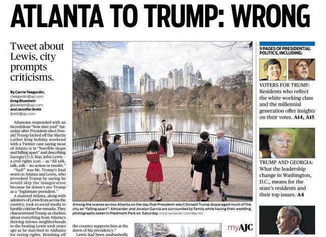 In their front-page story, the AJC noted that “incredulous” Atlanta residents “characterized Trump as clueless about everything from Atlanta’s thriving intown neighborhoods to the beating Lewis took years ago as he marched in Alabama for voting rights.”
