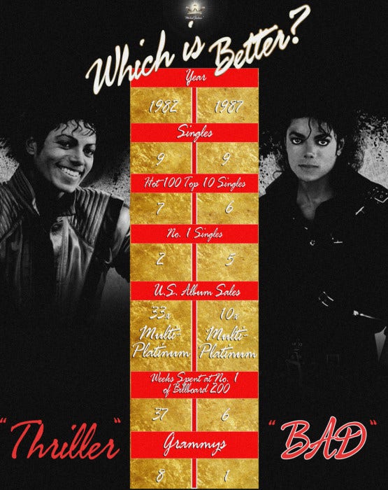 This week, both albums reemerged in the music conversations after Thriller earned the title for the highest-certified album in U.S. history after having gone 33x-platinum. Bad meanwhile was not far behind, scoring the RIAA Diamond Award for sales of over 10 million copies in the U.S.