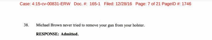 Wilson’s admission about Brown not grabbing his gun from his holster has also received strict scrutiny since this report became public. During initial depositions in the Wilson case, the officer claimed he and Brown battled for control of the gun after Brown had reached for it during their physical altercation on August 9th, 2014. This was a key fact for Wilson, helping justify his use of deadly force in believing he was under threat of imminent danger. Forensic evidence supported Wilson’s claim that Brown had reached for the gun. In this new court document, the Brown family’s attorney elicits an admission from Wilson that Brown never tried to take the gun out of Wilson’s holster.