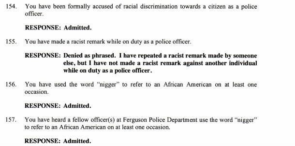 On Monday, Wilson’s attorney clarified this exchange by saying that the former officer never used the n-word on his own, but rather only when repeating others’ statements; this is a clarification Wilson himself made with respect to “racist remarks” as per item 155 as seen above, but didn’t bother to make with respect to the n-word. When asked why Wilson didn’t offer the same explanation about the n-word as he did about “racist remarks” during this discovery session, his attorney said “responses to requests for admissions are not invitations to tell a story or give a substantial narrative.”