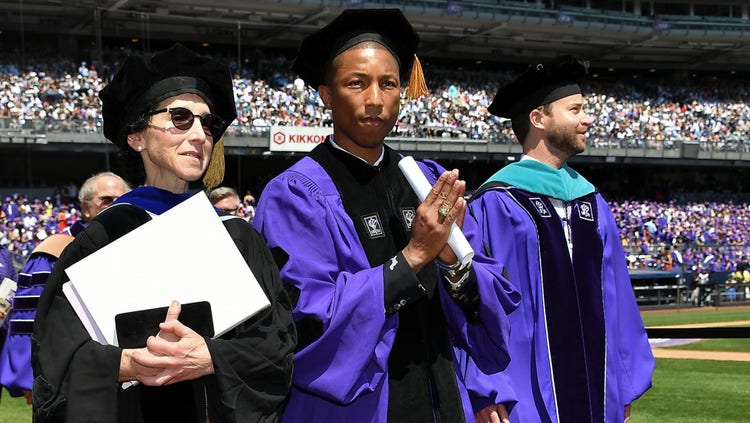 After blessing the two decades with sonic portraits and fashion landmarks, Williams walked through Yankee Stadium on Wednesday in a purple cap and gown as he prepared to give the commencement speech at New York University’s Class of 2017 graduation. In addition to delivering a 10-minute commencement speech to graduates, in which he praised their generation for creating change via social justice, equal rights and technology, Williams also received a Doctor of Fine Arts degree from the institution’s Tisch School of the Arts.