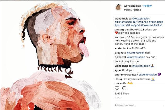 The artist, who goes by @WeHadNoIdea on Instagram, claims he “posted an image of a digital, oil-pastel style portrait” of XXX to the social platform in May. According to a provided screenshot, the rapper commented on the image himself, saying “THIS HARD.”