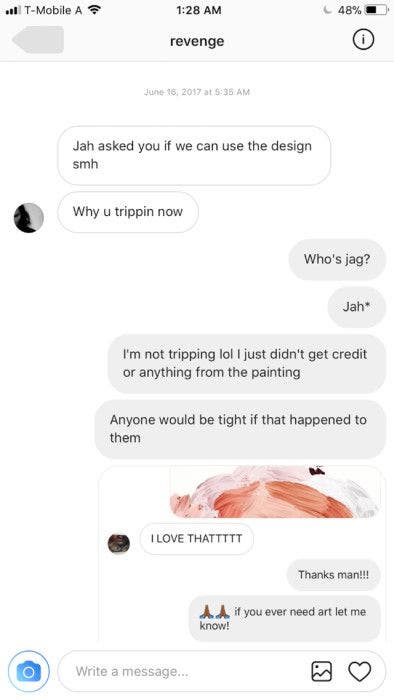 According to a screenshot, Revenge also seems to have contacted the artist on Instagram, writing, “[XXX] asked you if we can use the design smh. Why u trippin now[?]”