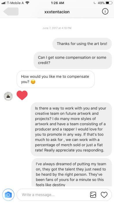 Equipped with screenshots, @WeHadNoIdea claims that, in June, he the artist thanked XXX for using his work, but asked for “some compensation or some credit,” or a “way to work with you and your creative team.” XXX seemingly responded with a smiley-faced emoji and heart and asked in return, “How would you like me to compensate you?”