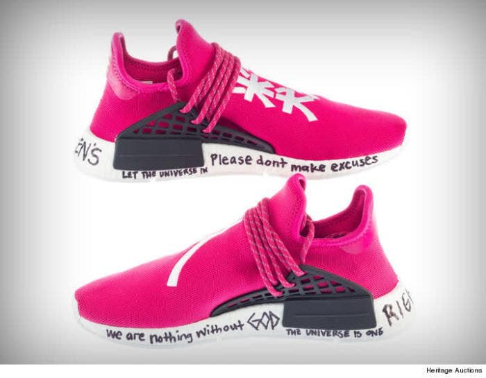 Pharrell is also auctioning a pair of Hu NMDs (size 9) from his collaboration with Adidas to benefit the same project. The hot pink-colored set have been signed by the super-producer with his initials and phrases including “women’s rights,” “let the universe in,” “please don’t make excuses,” “we are nothing without God,” and “the universe is one.” The sneakers also boast the Japanese characters for “friends” and “family.” They are currently going for$1,100