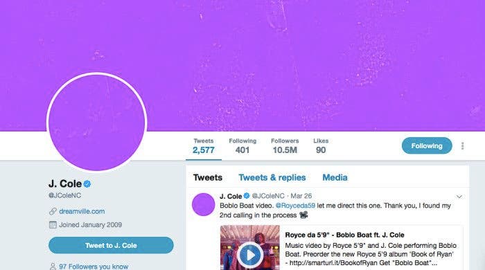 As of April 16, Cole has swapped the avatar and header on his social media pages, including Twitter. Going for a simple purple, the move is the first profile change on his pages since the release of Cozz’s Effected album.