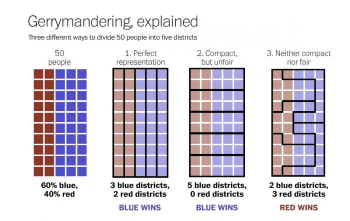 GERRYMANDERING IS ON THE LINE| And that brings us to gerrymandering. What is gerrymandering? Well, it’s an insidious old political trick in which the people in power in local government carve the map up into districts that minimize the influence of opposing interests, and to their party’s advantage. (Unsurprisingly, this usually occurs in such a manner as to minimize racial or socioeconomic influence.) This photo, via The Washington Post, illustrates it: