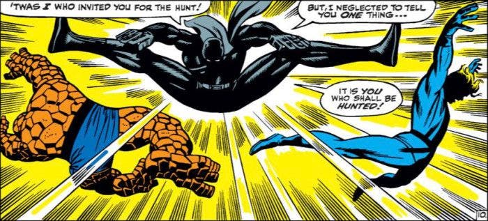 Tracking the Invisible Woman with his sense of smell, the Wakanda king pounces on Sue before she’s able to use her force field against him, gassing her with a “harmless” sleep toxin. Depending on The Thing to use his strength, a fountain of water had already been affected with a devitalizing fluid to minimize the hero’s power. Successful, Panther moves onto Mister Fantastic, using the leader’s love of Sue Storm to defeat him, locking titanium cuffs onto his rubbery wrists. Panther’s victory over the Fantastic Four proves fruitless as he is later defeated by Wyatt Wingfoot, schoolmate of Johnny Storm, who joined the team on their trip to the African nation.