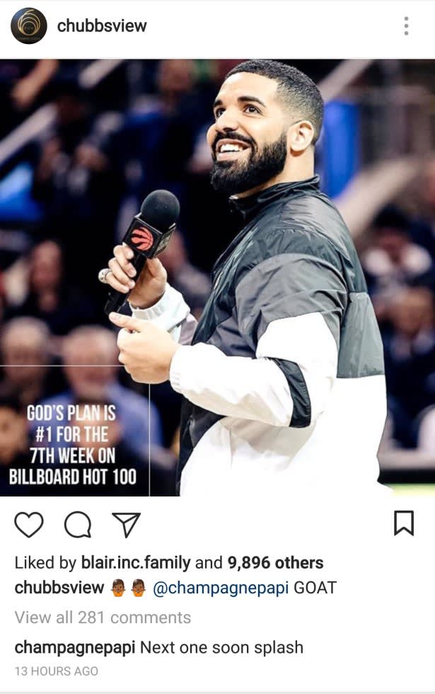 Perhaps because ample Drizzy fans have already heard the song, the 6 God himself chose to address the situation, albeit vaguely, on social media. While commenting on a post from Nessel “Chubbs” Beezer, which congratulated Drake on the success of his “God’s Plan” release, Drizzy wrote, “Next one soon splash.”