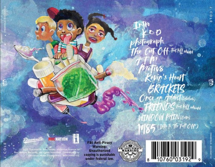 Brian “B. Dot” Miller, of Tidal’s Rap Radar podcast, previously shared that the album title’s acronym had three different meanings—”kidz on drugz,” “king overdose,” and “kill our demonz”—and the project’s artwork reflects that. The painting-inspired images feature Cole in the form of a king, but under his cloak sit both skeleton heads and kids taking pills, sipping Lean, and snorting drugs.