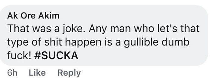 “That was a joke,” he responded, answering a woman’s question about the validity of the claim. “Any man who let’s that type of s–t happen is a gullible dumb f–k! #SUCKA.”