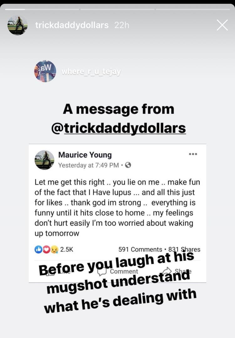 Trick responded to the jokes and memes by letting his fans know how much the disease affects him. In a message shared on his Instagram story, he wrote, “Let me get this right… you lie on me… make fun of the fact that I have lupus… and all this just for likes… thank god im strong…everything is funny until it hits close to home…my feelings don’t hurt easily I’m too worried about waking up tomorrow.”