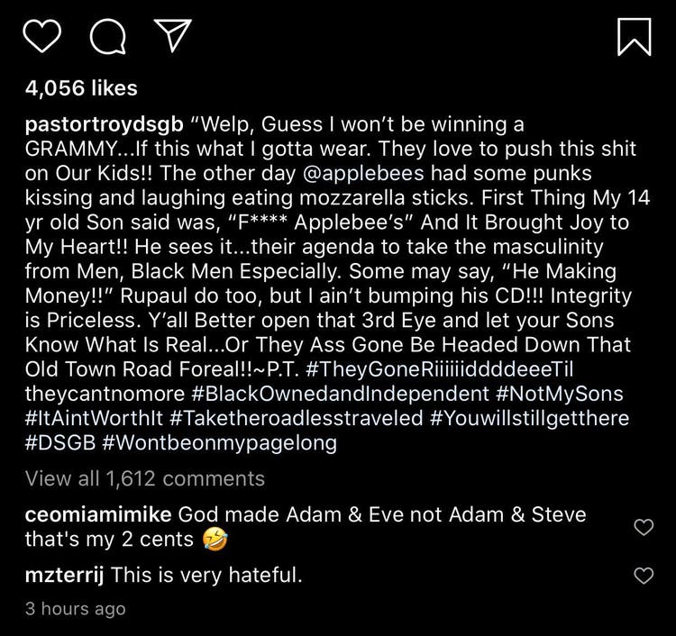 Pastor Troy is currently the number one trending topic on Twitter…and it’s not for his music. Pastor Troy took to Instagram to share his thoughts on how he believes Lil Nas X and Applebee’s push a gay agenda on black men.