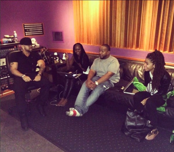 Kirby (far right) in the studio with Timbaland (center)