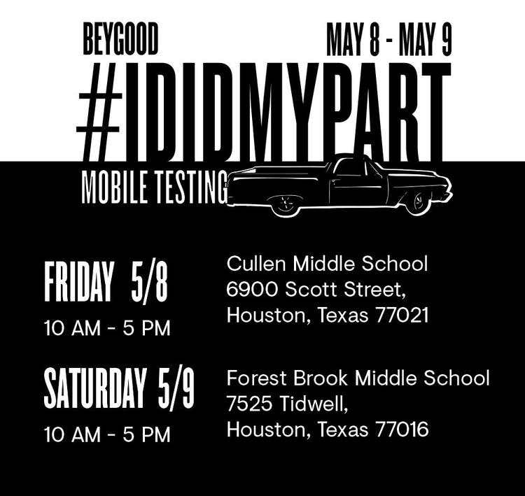 According to a press release, the #IDIDMYPART Mobile Testing Relief Campaign will offer free testing to the citizens of Houston. They will also provide them with free face masks, gloves, essential vitamins and household supplies. In observance of social distancing measures, participants will never have to exit their vehicles.