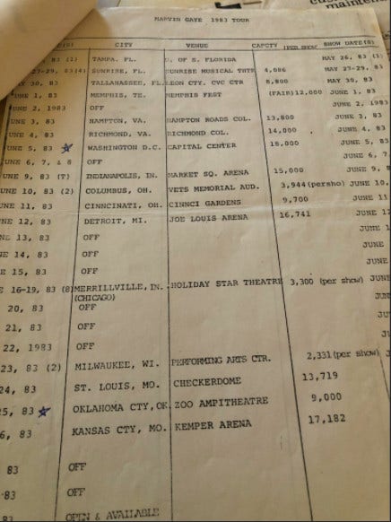 K.C. Jackson’s original copy of Marvin Gaye’s Midnight Love Tour schedule (1983)