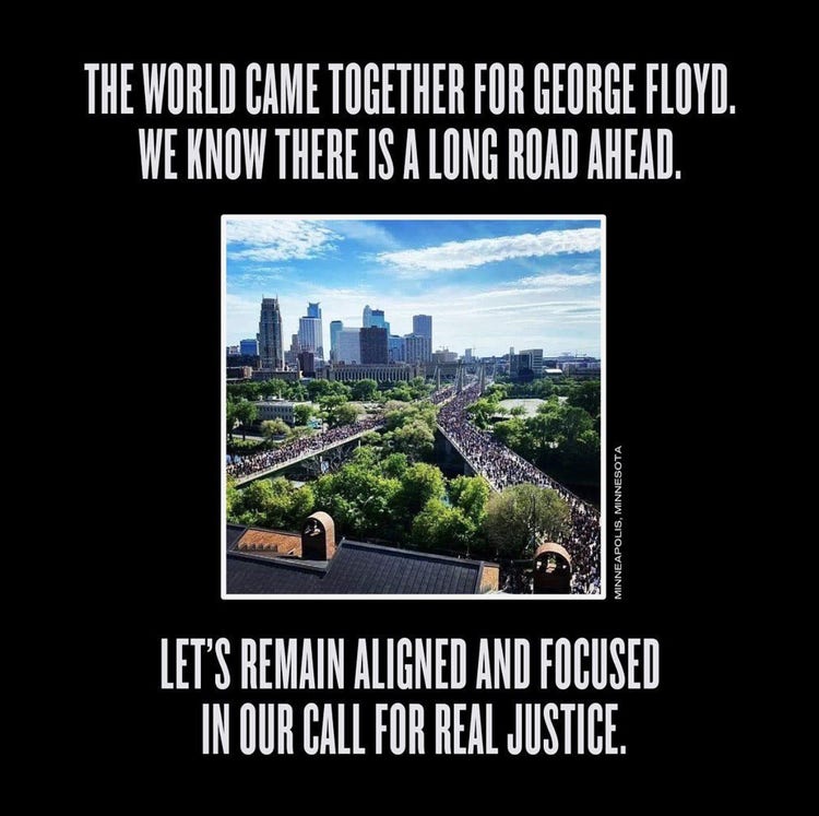 “The world came together for George Floyd,” the multi-platinum selling singer captioned a photo of Minneapolis protests. “We know there is a long road ahead. Let’s remain aligned and focused in our call for real justice.”