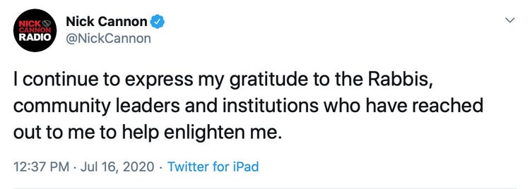 “He is clear and remorseful that his words were wrong and lacked both understanding and context, and inadvertently promoted hate. This was important for us to observe,” the broadcast company said in a statement. “Nick has sincerely apologized, and quickly taken steps to educate himself and make amends. On that basis and given a belief that this moment calls for dialogue, we will move forward with Nick and help him advance this important conversation, broadly.”