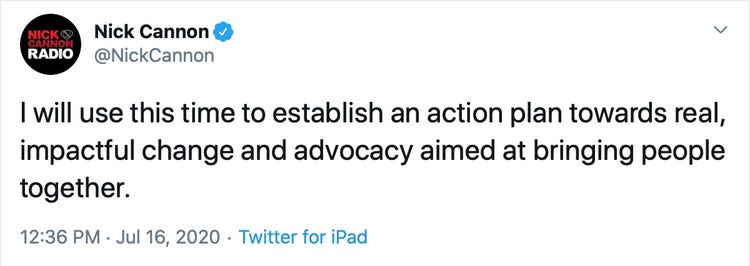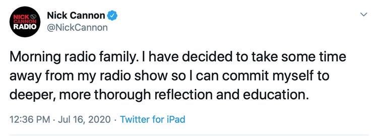 “Morning radio family. I have decided to take some time away from my radio show so I can commit myself to deeper, more thorough reflection and education,” Cannon tweeted. “I will use this time to establish an action plan towards real, impactful change and advocacy aimed at bringing people together.”