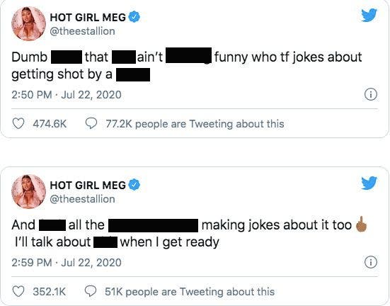 Just to name one example, John Legend’s wife, Chrissy Teigen, put out a tasteless tweet following news that Megan had been shot. Though she is typically crowned one of the clap back queens with the tightest Twitter fingers, it’s never the right time to poke fun at someone who is currently in recovery from a violent attack. Sure, the joke probably did not intentionally mean any harm or ill-will, but that was not the time. Though her issued public apology seemed genuine, some of Teigen’s own loyal followers considered it too insensitive and poorly timed because of the rapper’s condition.