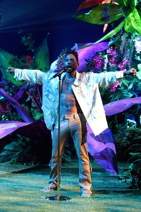 Rihanna eventually made an appearance at her show, emerging from flower petals in glistening lingerie. The fashion event also featured performances from Travis Scott, Rosalía, Bad Bunny, Ella Mai, Mustard and Roddy Ricch.