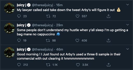 When Juicy got wind of the news, he took to Twitter and expressed his thoughts. “Good morning!” he wrote. “I Just found out Arby’s used a Three 6 sample in their commercial without clearing it hmmmmmmmmmm.”