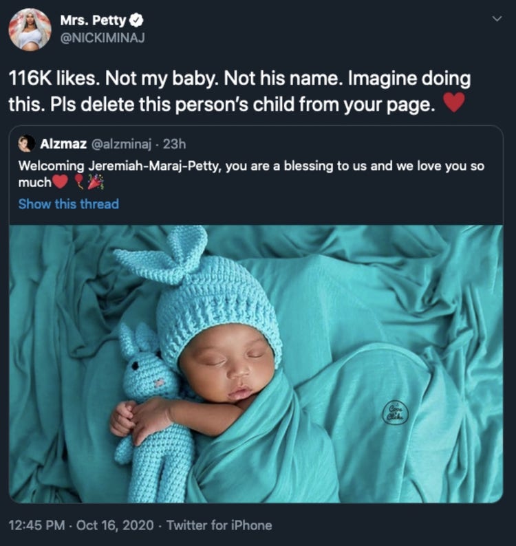 “116K likes. Not my baby. Not his name. Imagine doing this. Pls delete this person’s child from your page,” she wrote before blocking the Twitter account.