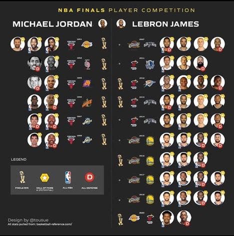 When it comes to the playoffs, no player has scored more points than James. He became just the fourth player in history to make 10 Finals appearances – including a staggering eight straight with the Heat (4) and the Cavaliers (4). Ironically, critics have used James’ number of trips to the Finals in their arguments against him. In those ten trips, he’s come away with four titles while Jordan went on to win the championship in each of his six trips to the Finals. Even more impressive, Jordan and the Bulls won six titles in eight seasons.