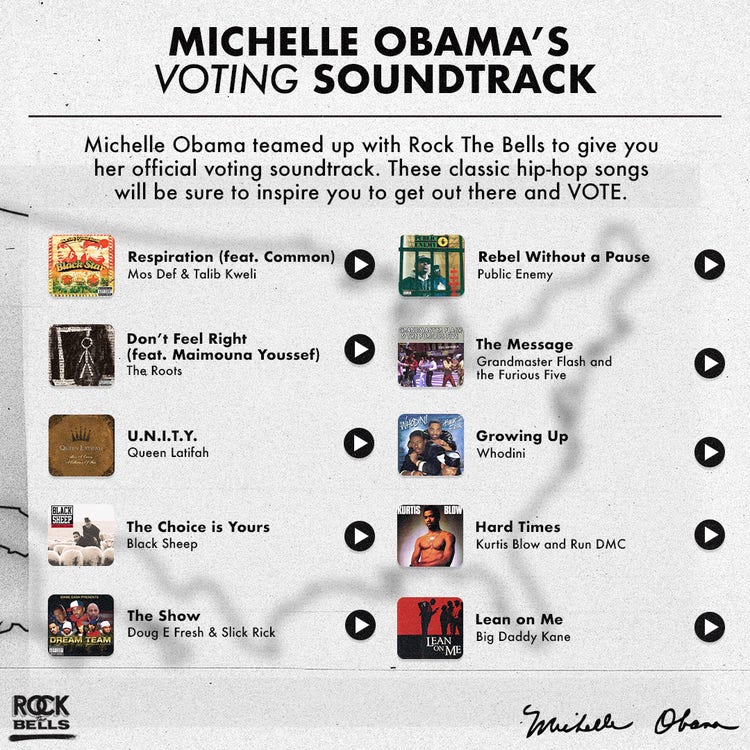 The former First Lady teamed up with LL Cool J’s Rock The Bells to create a 10-track playlist of hip hop songs that embody the importance of voting. The playlist includes songs from artists such as Public Enemy, Black Sheep, The Roots, Black Star, Whodini, Queen Latifah, Doug E. Fresh, Slick Rick, Grandmaster Flash & The Furious Five, Kurtis Blow, Run-DMC and Big Daddy Kane.