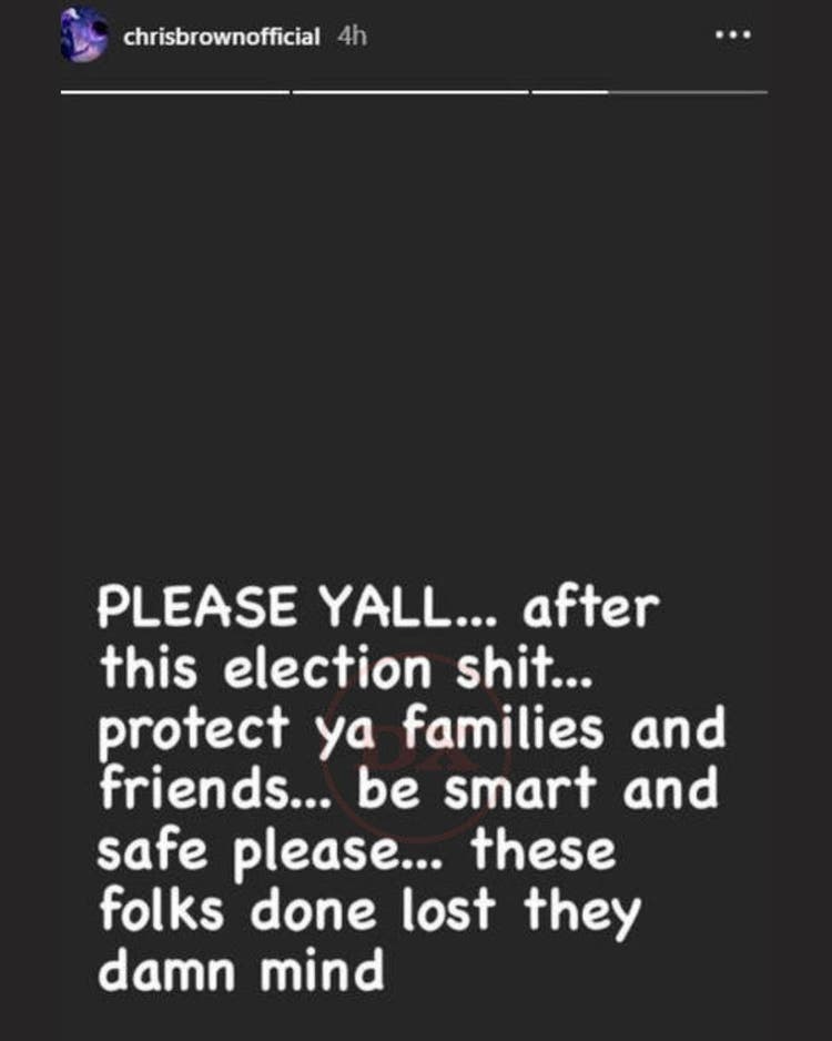 “PLEASE YALL… after this election shit… protect ya families and friends,” he wrote in his Instagram Story. “Be smart and safe please… These folks done lost they damn mind.”