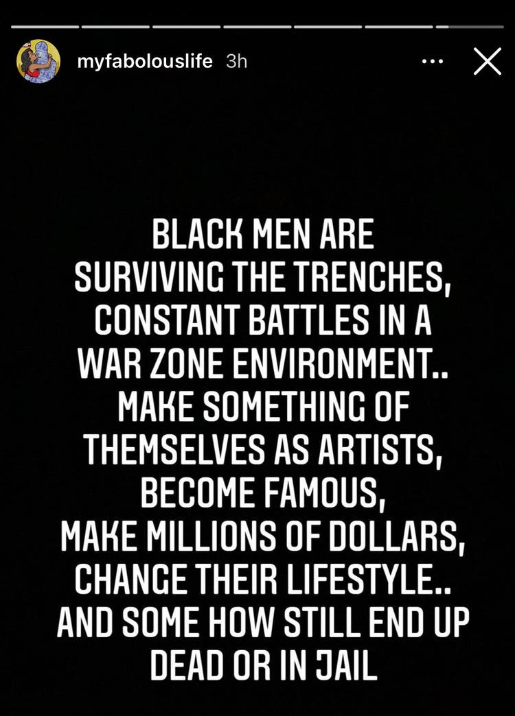 “Black men are surviving the trenches, constant battles in a war zone environment.. make something of themselves as artists, become famous, make millions of dollars, change their lifestyle.. and some how still end up dead or in jail,” he wrote in a follow-up post.