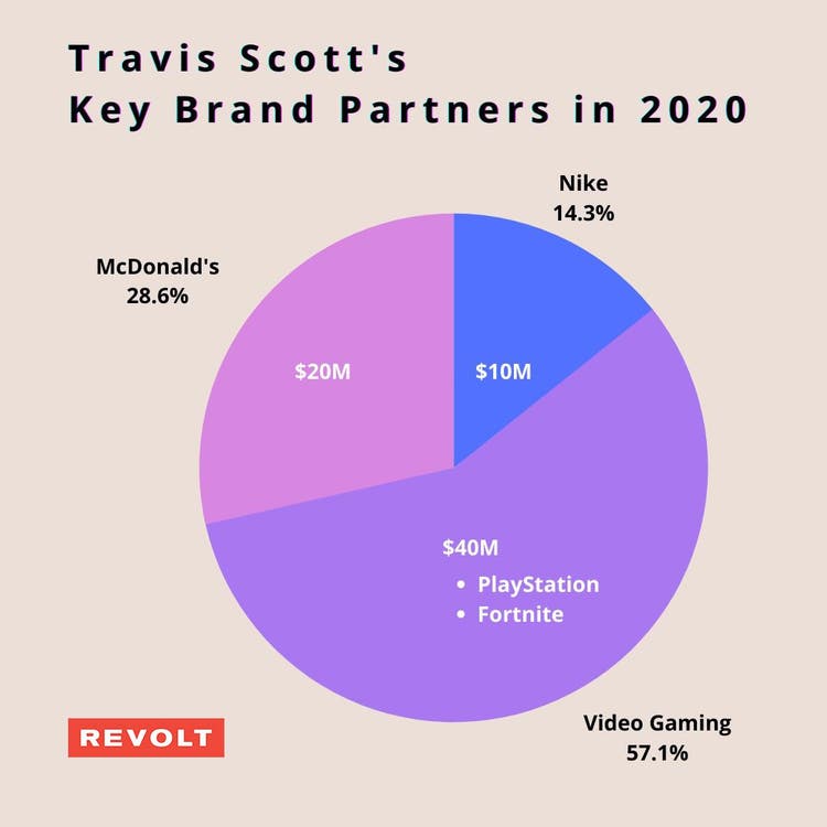 In 2020, tour money for artists disappeared, album releases got delayed; and any other scheduled entertainment events like film soundtracks and festivals were paused indefinitely, cancelled or rerouted to digital platforms for streaming. COVID-19 has left many musicians pressed for more income. But, not Travis Scott. The Houston-born artist has continued to secure more bags through a series of strategic corporate partnerships with the likes of Nike, Sony, Epic Games, McDonald’s, and more.